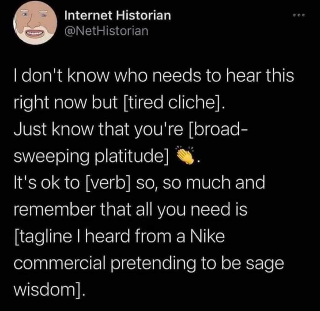 If it’s not said to you, for your situation, all it sounds like is this post. Absolute pandering that just feels worse when you’re actually in a tough spot that words cannot fix.