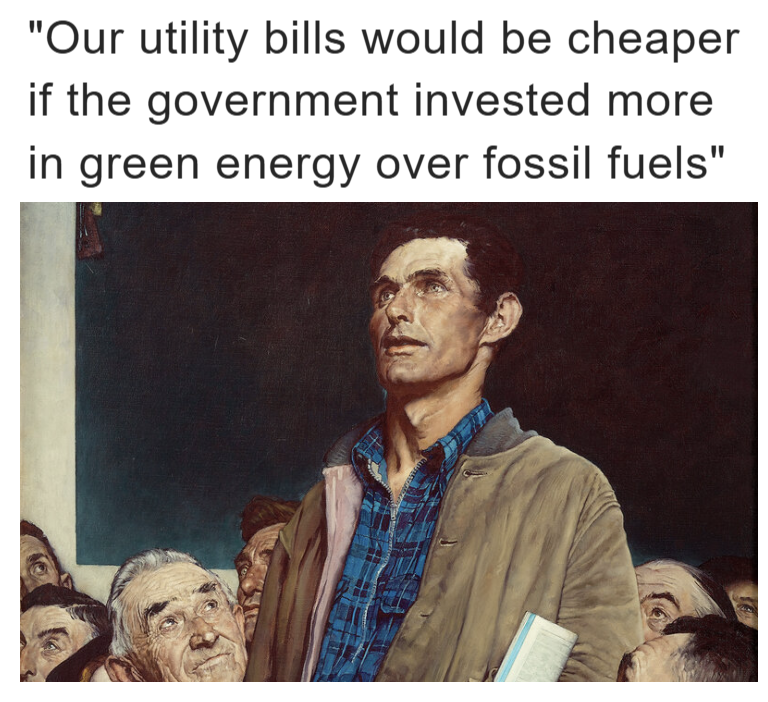 “Oh, new innovations in technology can help consumers pay less to power their homes? We can’t have that! It would affect the profits of my friends Oil Baron and Coal Baron.”