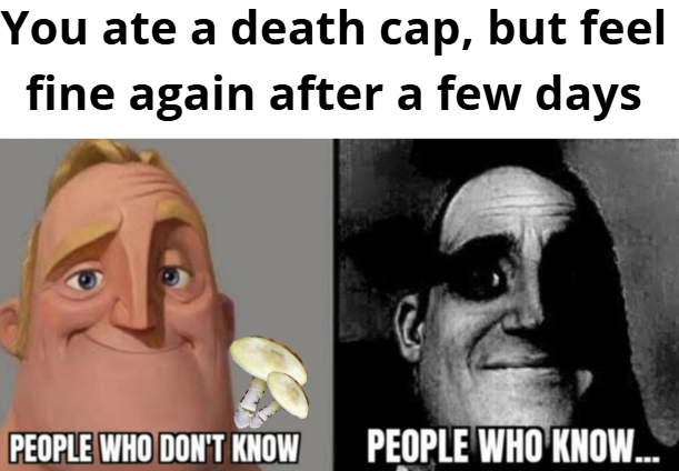 Context: after eating a death cap (Amanita phalloides), you’d notice a few of the symptoms at first, but these usually resolve after a day or two. After this, you’ll enter a latent phase where you feel fine, but your liver and kidneys slowly start to fail. By the time you notice, it’s usually already too late.