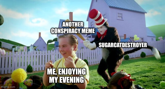 (Cat with a hat meme - “Me enjoying my evening”, “SugarCatDestroyer”, “Another Conspiracy Meme”)