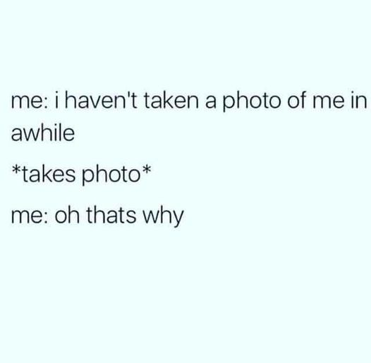 Only selfies I’ve taken in the last … what, 5 years? were for bodyfat tracking purposes (it’s trending upwards, unfortunately). And a dick pick because why not - at least I’m confident about that part of my body.