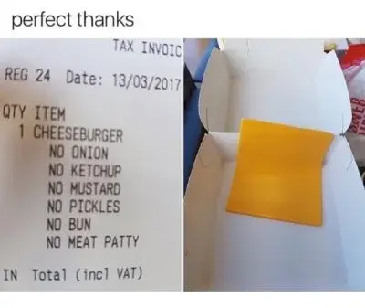 themaninblack@lemmy.world to memes@lemmy.world · 15 days agoMinimalist cheeseburgerlemmy.worldimagemessage-square29linkfedilinkarrow-up1385arrow-down19
