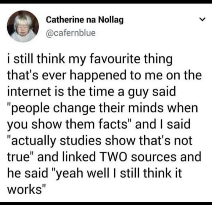 To be fair, this is A pretty complex thing, you can show facts to some people and if it doesn’t fit their narrative they will not follow, but there are others who are open. What he should have said was okay there is a trend of this but in my personal experience there are people who do not have this issue as well. And that’s not even considering how you approach something, if you come in guns blazing and condescending people will shut you down no matter what facts you have. If you come in understanding and willing to discuss, people are more open to changing their mind. It kind of sounds like op found the two articles didn’t actually read them and considered herself the “winner” on this