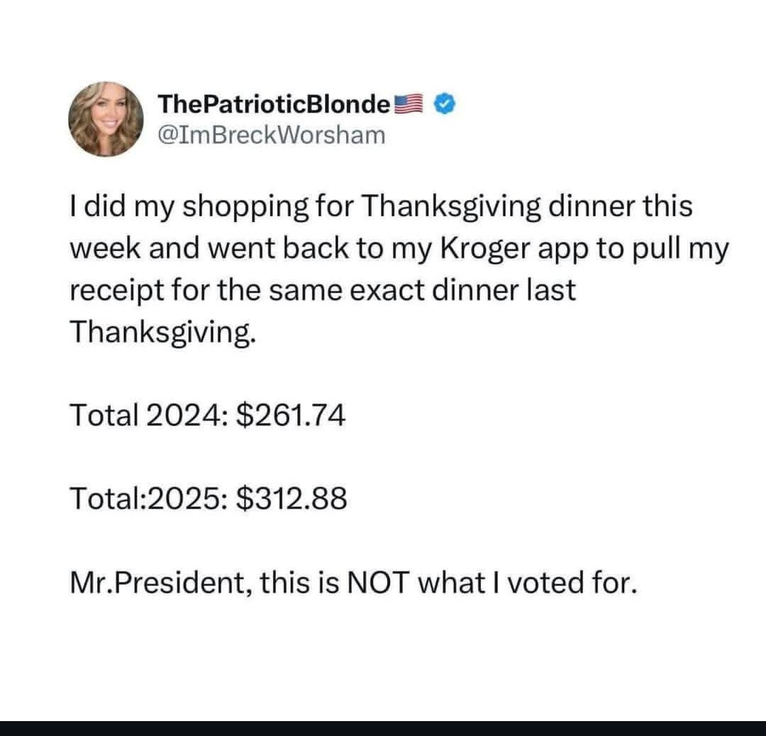 This got reported as “not LAMF” on the grounds that this person voted for lower grocery prices and got higher ones. This is an understandable argument, because just getting tricked on its own (even if you’re unbelievably stupid to think that things like illegal tariffs and deregulation wouldn’t do this) is not LAMF.