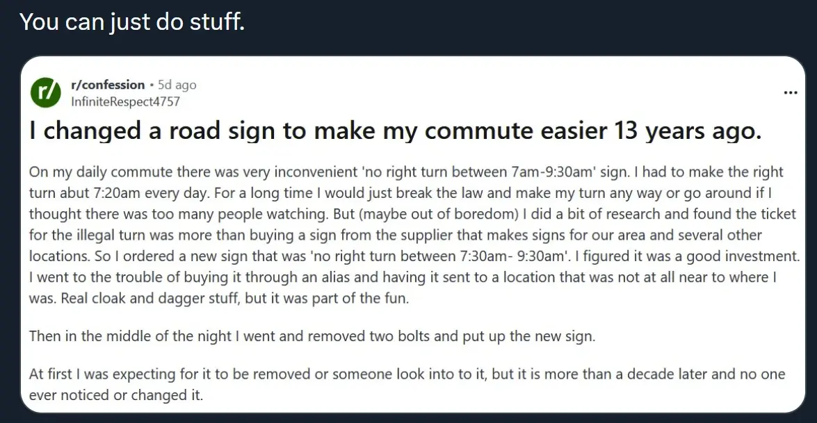 You’re right, illegally changing a public sign on a public road in order to make your own commute marginally shorter is absolutely just totally cool, and you would know because you “work for the government”.