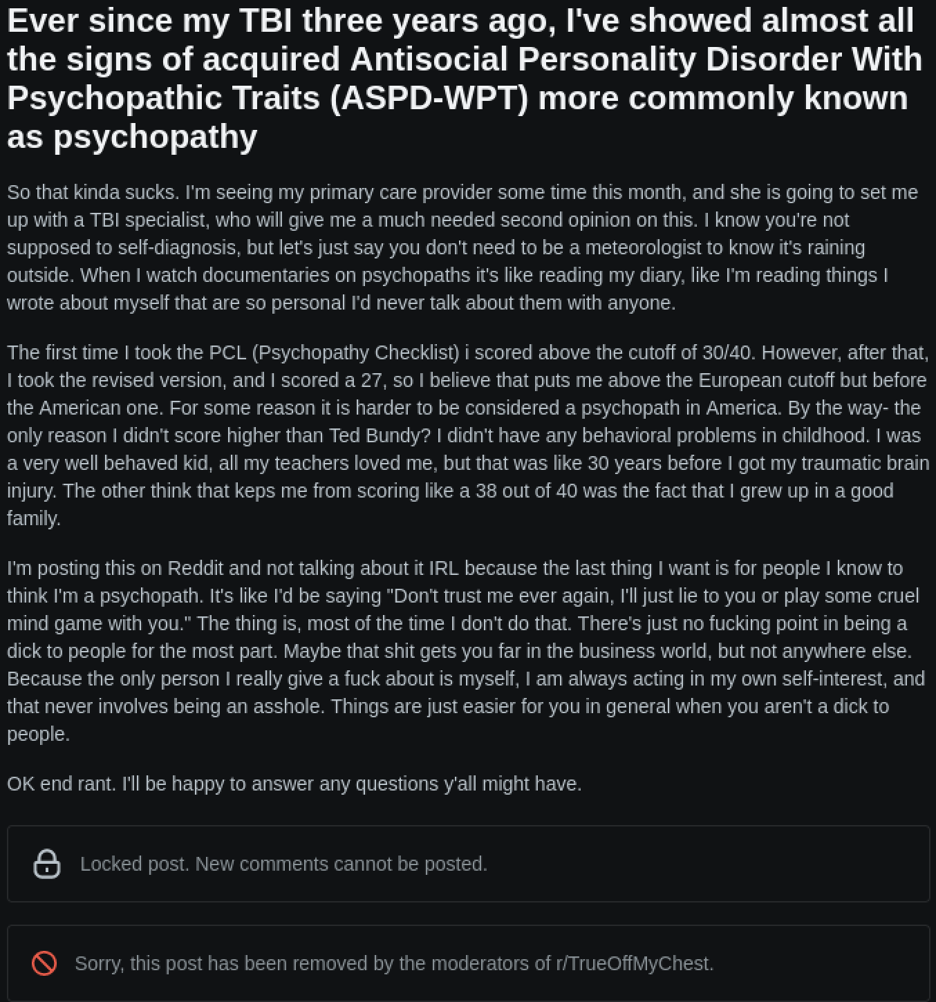 minus-squarejubilationtcornpone@sh.itjust.workslinkfedilinkarrow-up5·23 days agoTraumatic Brain Injury