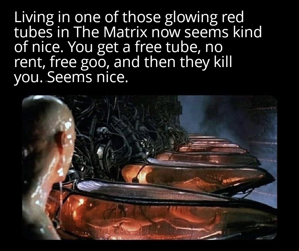minus-squareTachyonTele@piefed.sociallinkfedilinkEnglisharrow-up1·12 days agoMaybe the matrix needs a little more processing power, so it puts people in comas and gives dementia to save on bandwidth. Or something.