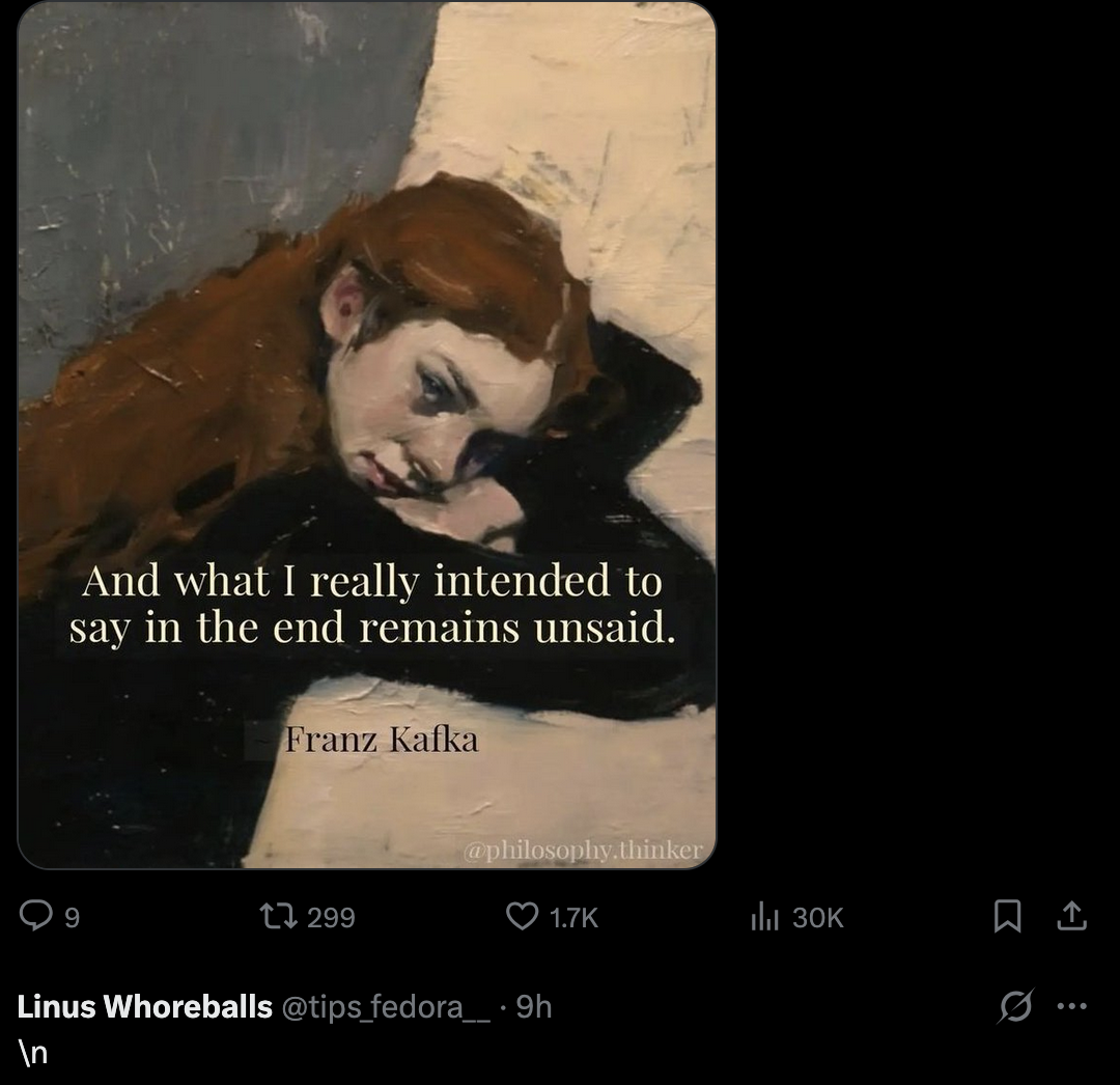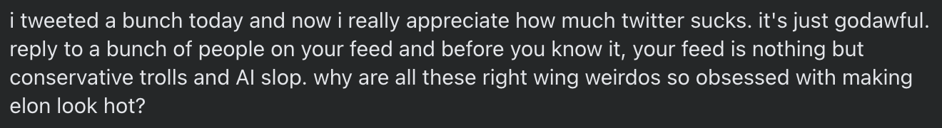 26·18 days agomy home feed is absolute trash, it’s mostly AI slop survey pics run by elon dickrider bot accounts. many of these accounts use grok to make elon look hot. i’m trying to start replying to different people so my home feed is slightly less garbage.